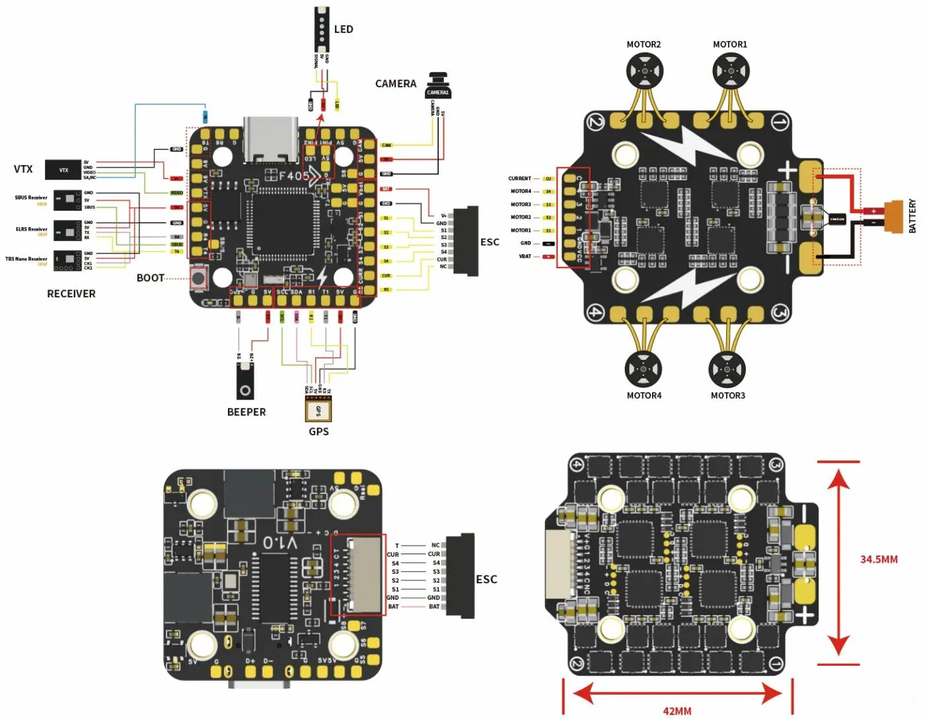 - Физические размеры 4-in-1 ESC меньше, что упрощает установку в компактные рамы.