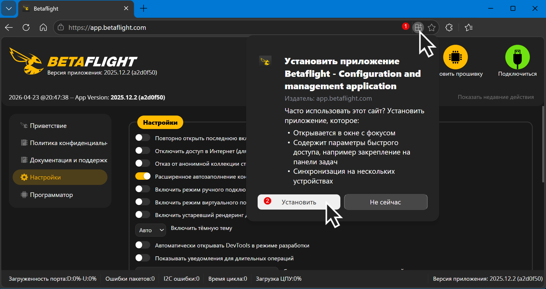 Главная мысль: начиная с версии 2025.12 Betaflight Configurator распространяется как Progressive Web App (PWA). Вы не скачиваете установщик — вы открываете https://app.betaflight.com/ в современном браузере и устанавливаете приложение прямо оттуда.