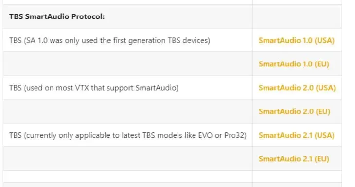 Для корректной работы SmartAudio необходимо загрузить таблицу частот, соответствующую вашему VTX.