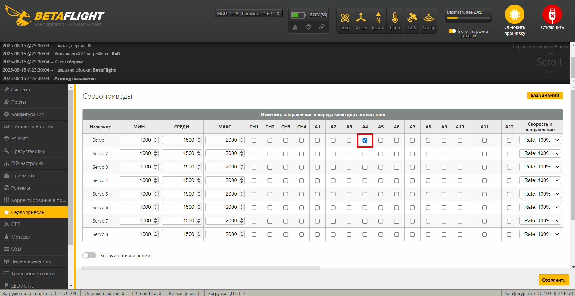 - Перейдите во вкладку Servos (или Modes в старых версиях).