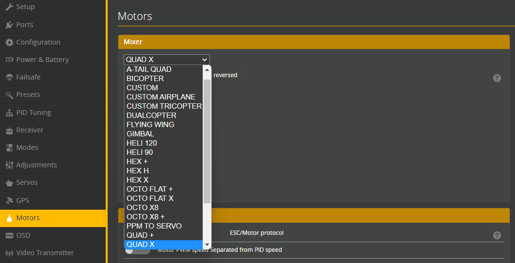 Betaflight поддерживает несколько встроенных конфигураций микширования, а также пользовательское микширование. Конфигурации микшера определяют, как сервоприводы и моторы взаимодействуют для управления летательным аппаратом.