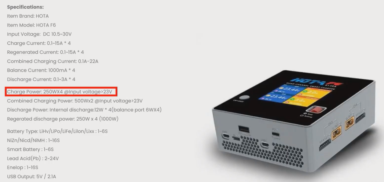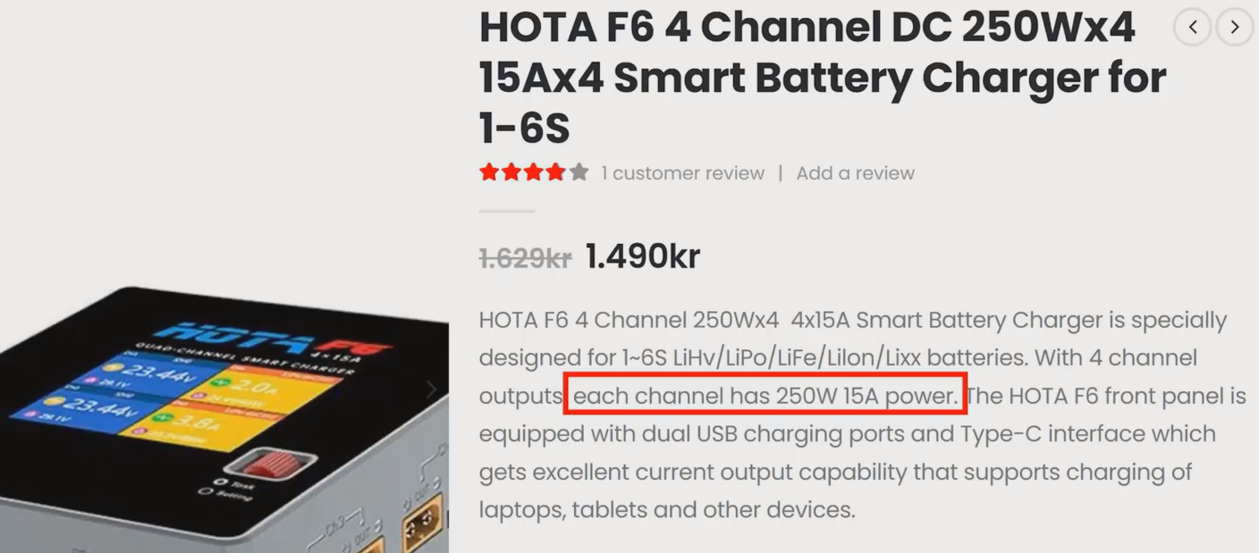 Например, я имею зарядную станцию без блока питания, и мне нужно правильно выбрать мощность будущего блока питания, чтобы заряжать свои аккумуляторы. В описании для этой зарядной станции написано, что 4 канала могут выдавать 250 Вт с силой тока в 15А каждый, то есть в сумме он может заряжать аккумуляторы с мощностью 1000 Вт.