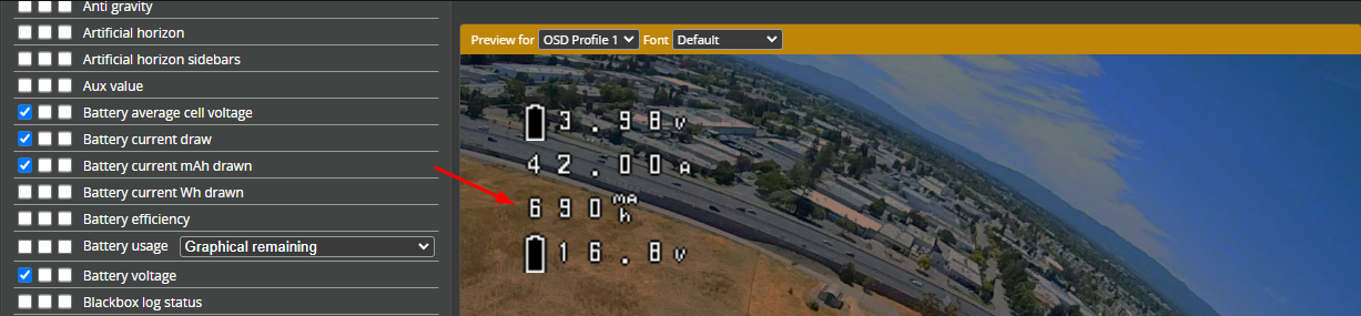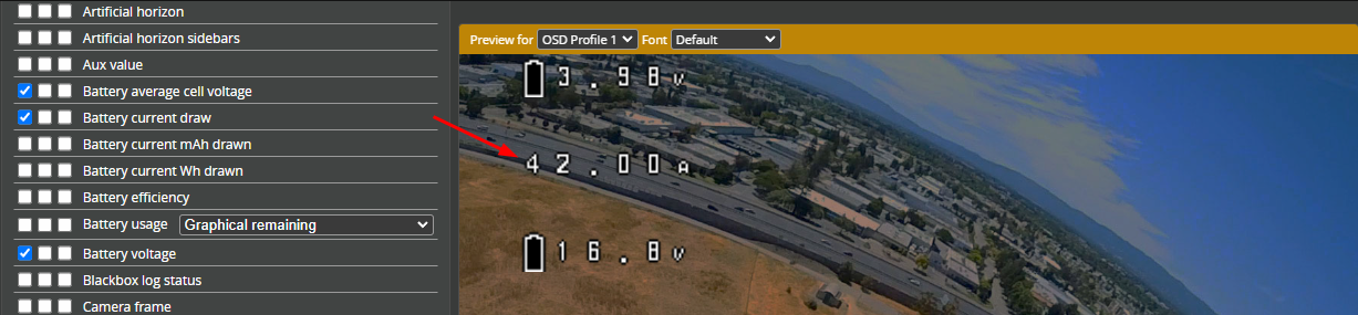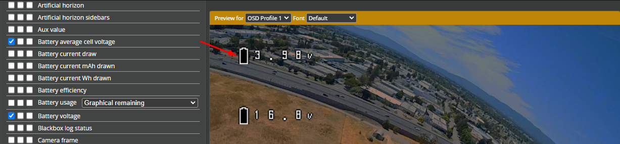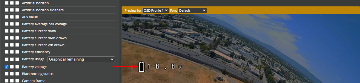 Battery Voltage — это отображение текущего напряжения аккумулятора во время полета дрона. Измерение напряжения происходит с помощью специального датчика напряжения, который находится во Flight Controller (полетном контроллере). Это один из самых важных показателей заряда аккумулятора, за которым пилот постоянно следит. Он дает возможность правильно планировать время полета и момент посадки. Этот параметр обязателен для использования. [Обязательный параметр]