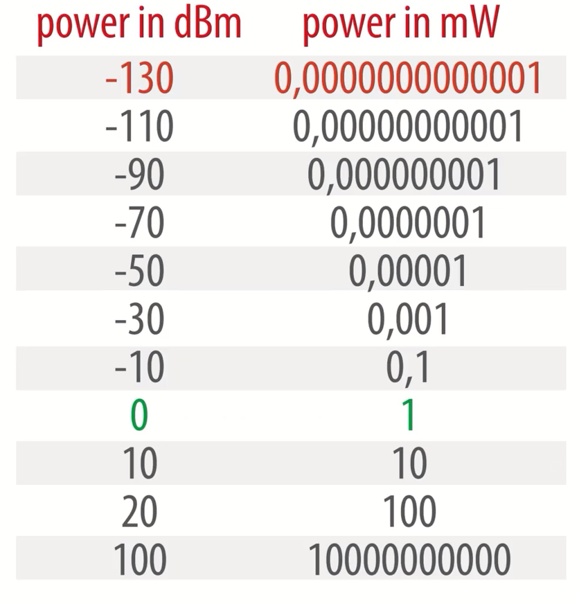 Использование dBm лучше, чем милливатт, поскольку приемники могут обнаруживать невероятно слабые сигналы, которые сложно выразить в милливаттах. Например, мы можем видеть такие значения, как –120 dBm. Гораздо проще использовать децибелы, когда в милливаттах так много нулей.