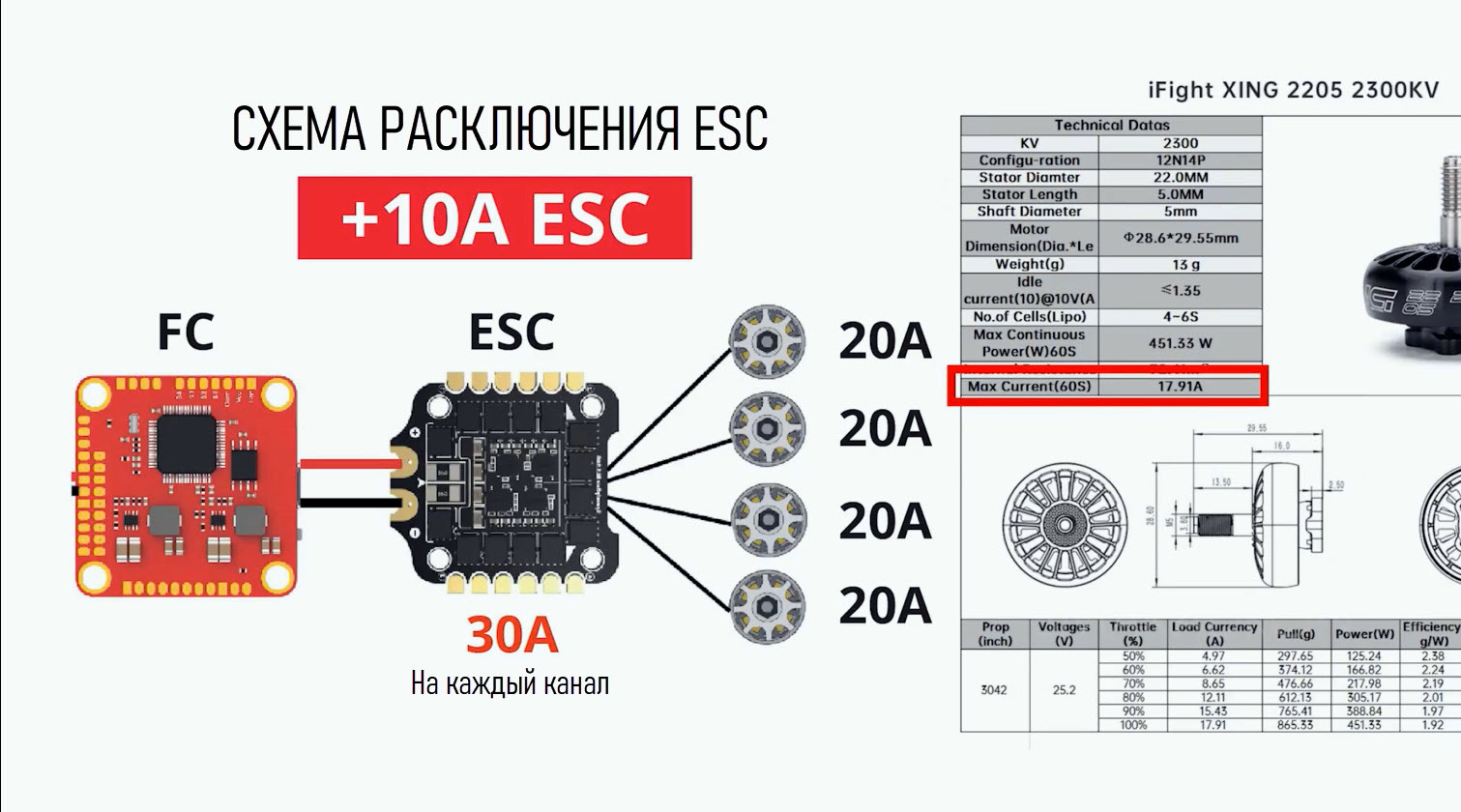 Для безопасности рекомендуется брать ESC с номинальным током минимум на 10 А выше, чем максимальный ток двигателя по паспорту. Например, двигатель с потреблением 20 А требует ESC на 30 А.