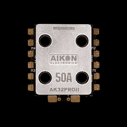 Aikon AK32Pro II 50A — это хороший пример ESC, который не пытается брать только одной цифрой тока. В спецификации GetFPV указаны 2–6S, 50A continuous / 65A burst, 20×20 крепление, AT32F421, BLHeli_32, вес 16 г и PWM до 96 кГц. Отдельно отмечены dual MOSFET packages и ориентация на самые быстрые DShot input rates.