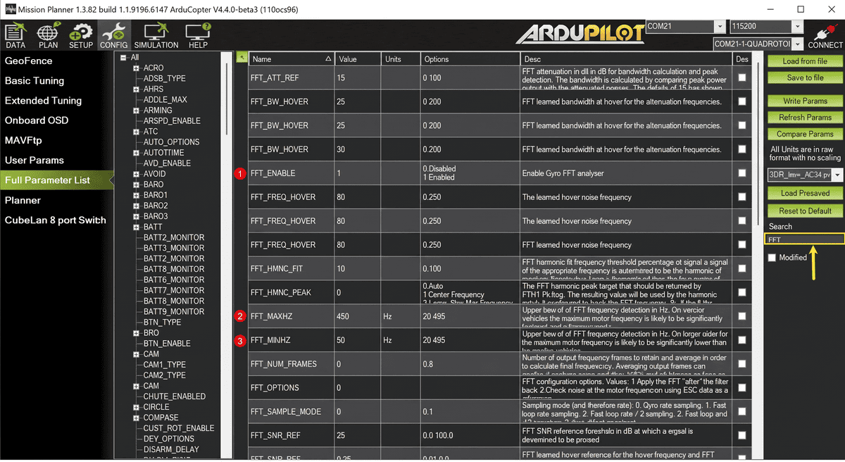 Путь в интерфейсе Mission Planner: Setup → Optional Hardware → FFT Setup.