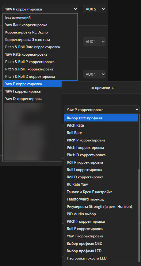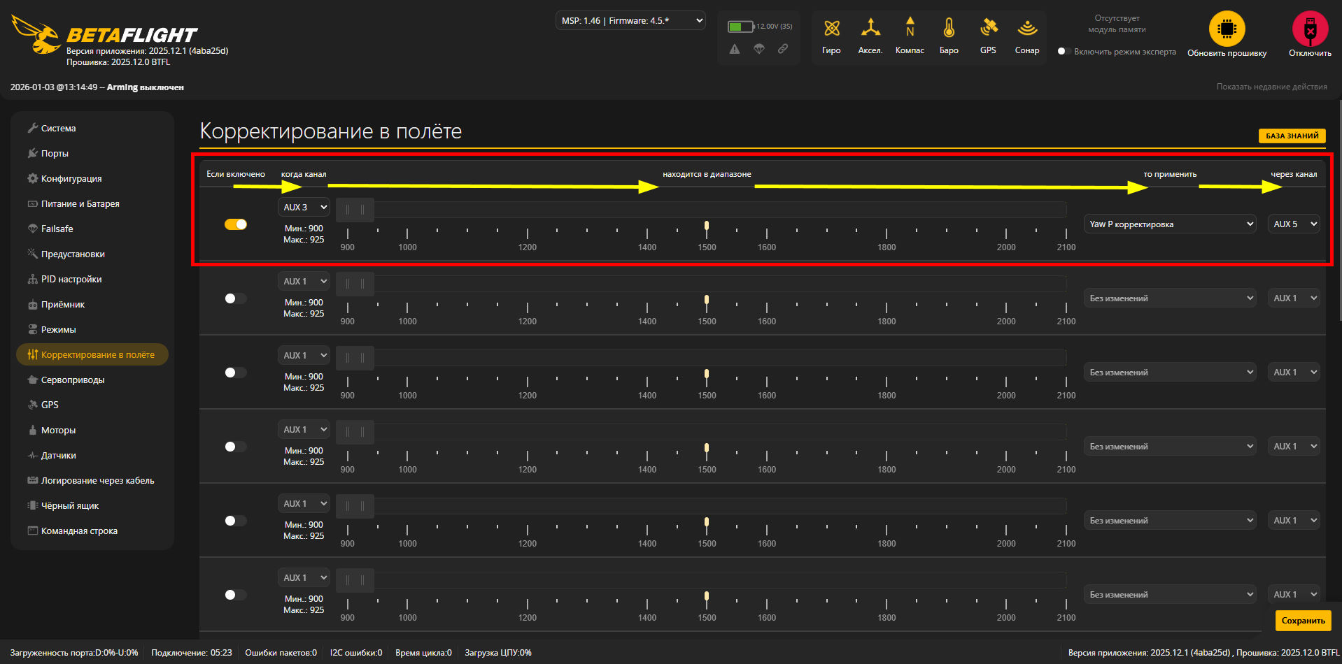 Когда тумблер (AUX3) активен → "крутилка" AUX5 меняет параметр Yaw P в заданном диапазоне.