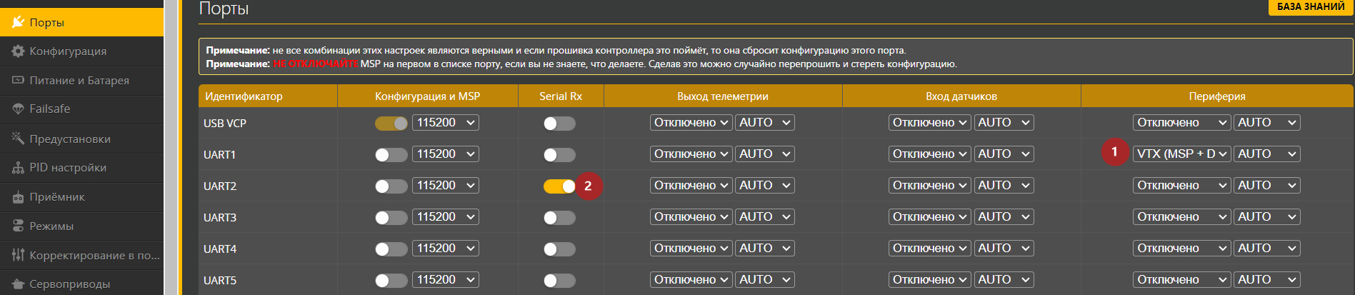 - Если вы используете последовательный приемник, такой как ExpressLRS и Crossfire, вам нужно включить "Serial RX" на том UART, к которому он подключен.