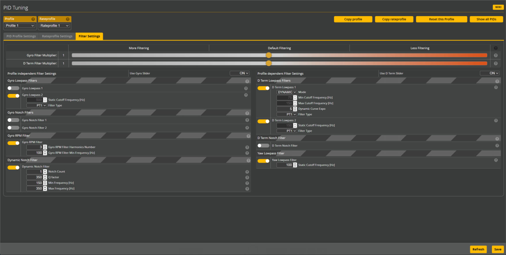 Тип фильтра по умолчанию — PT1, хотя некоторые пользователи используют только один динамический фильтр Biquad без второго PT1.