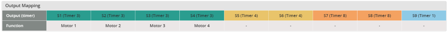 Эта таблица напрямую связывает физические выходы на плате (Output) с их функциями (Function) в логике полетного контроллера.