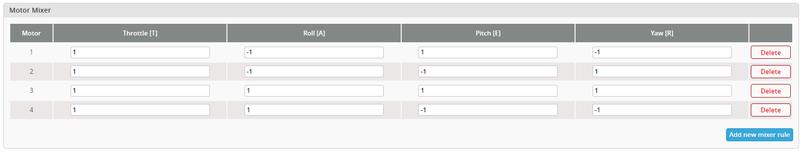 - Кнопка "Delete" (Удалить): Позволяет удалить правило смешивания для конкретного мотора (используется в пользовательских конфигурациях).
